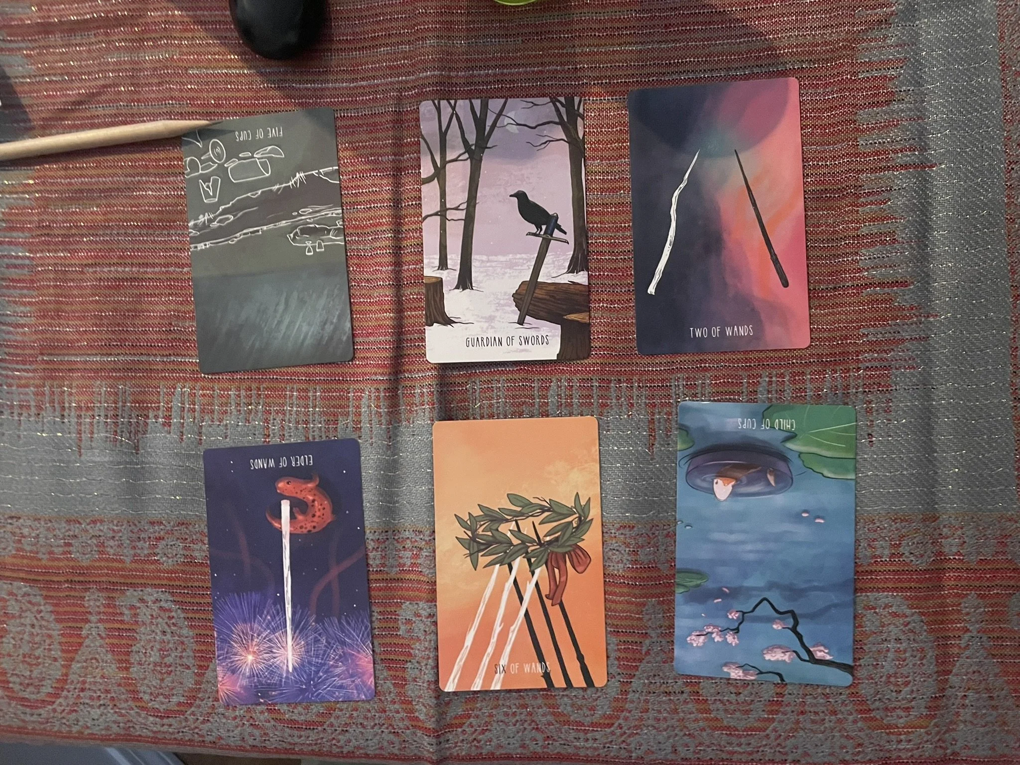 The cards I pulled for our group tarot reading. I used the Spacious Tarot deck by Annie Ruygt and Carrie Mallon.