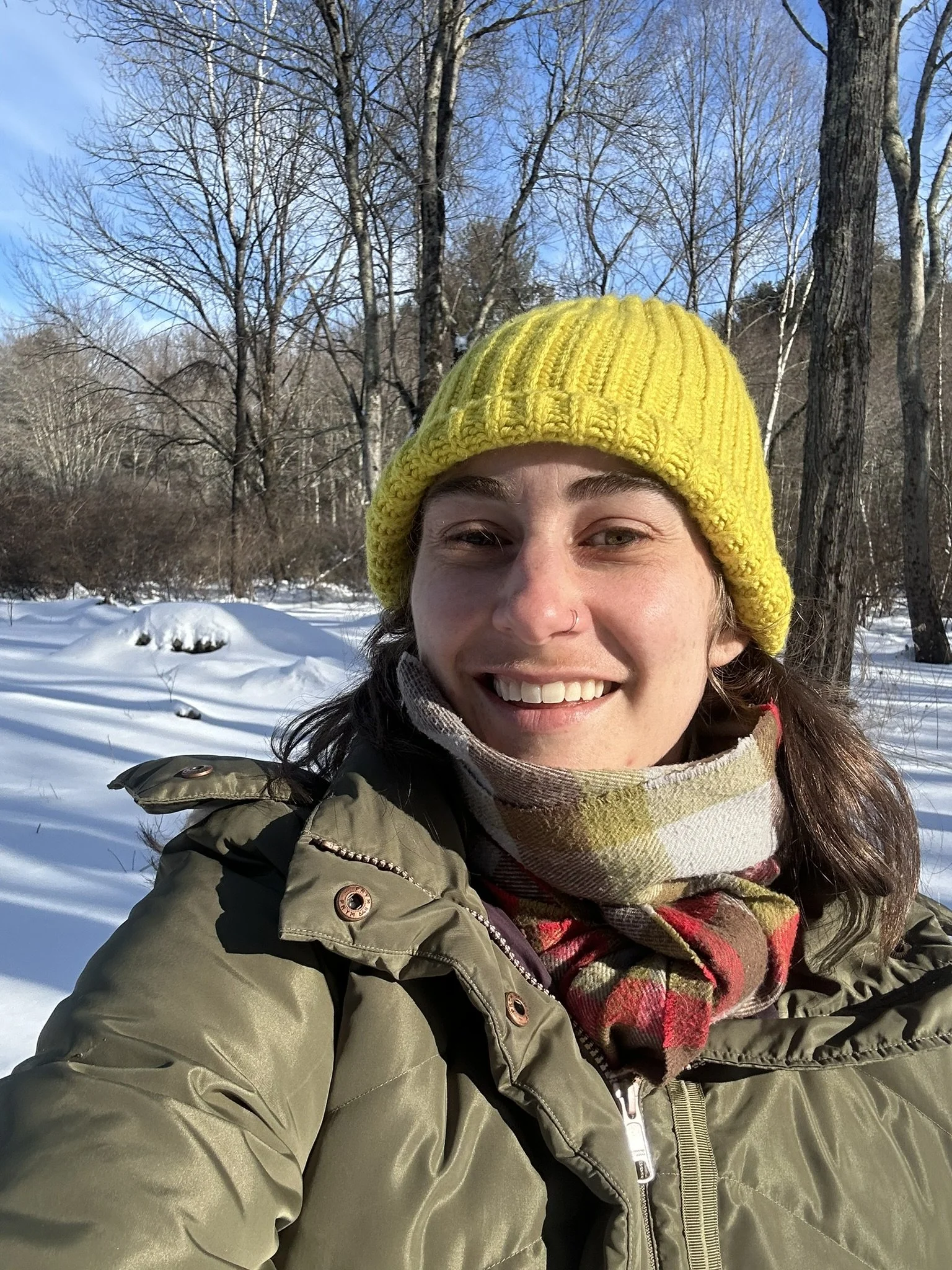 Me in an olive green coat, plaid scarf and yellow hat, smiling into the sun with the snowy Concord, MA woods behind me. I visited my parents last weekend and I went snow shoeing, which was a great time and is where I took this photo.