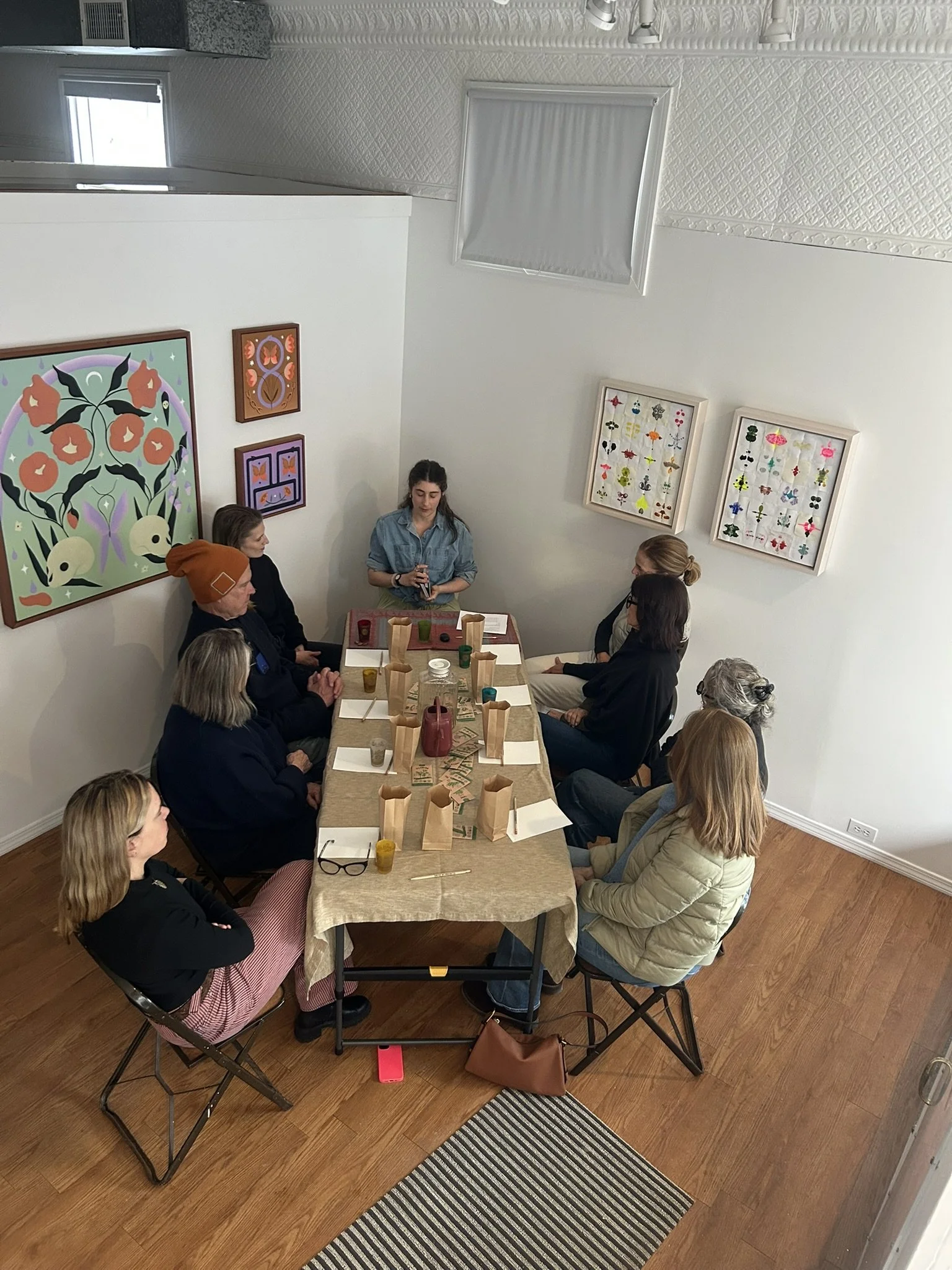 Me leading a tarot reading and early spring ritual at Drive-By Projects in MA last weekend. Participants are seated at a long table with materials in front of them, and all around us is the art in Drive-By’s current show, “Magic.” Pretty perfect :)