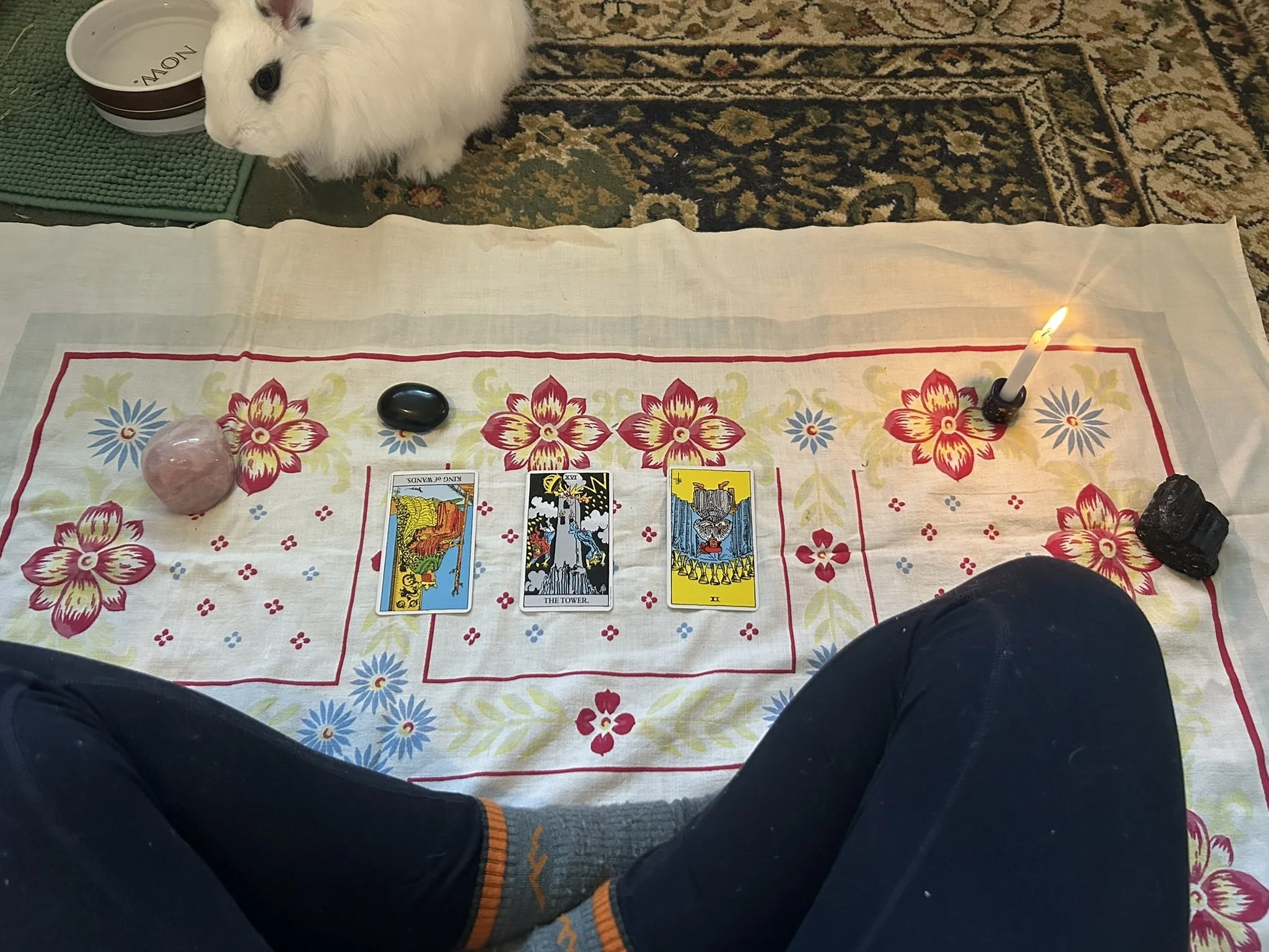 Tulip keeping me company while I performed a ritual for a client. (A tablecloth printed with blue, yellow and red flowers laid with three Tarot cards, a rose quartz, 2 black tourmalines, and a lit small candle)
