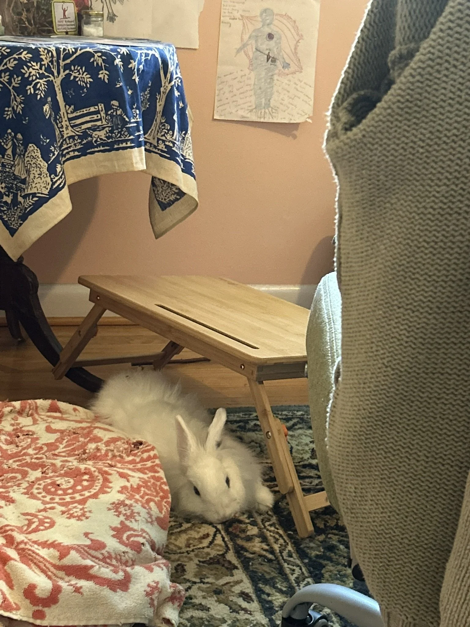 Starting strong with Tulip the rabbit napping adorably under my floor desk! I ordered my floor chair and desk in order to sit near her, but she quickly adopted them as her bed and burrow.